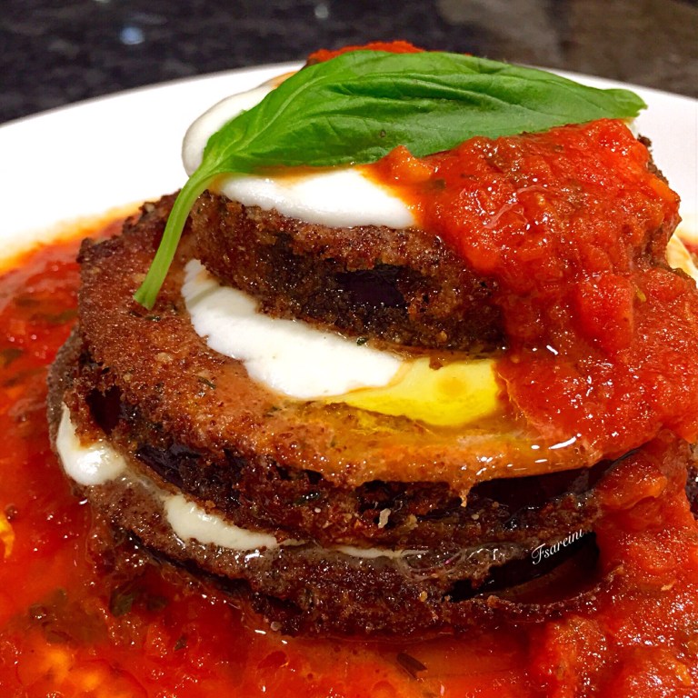 Place the sauce on the center of an oven safe plate, and then stack 3 cooked and breaded eggplant steaks, with one slice of fresh mozzarella between each slice saving the last slice of cheese for the top of the stack. Place the stacked plate in a 400F oven until cheese melts. Remove from oven, drizzle with olive oil, garnish with basil leaf and enjoy!